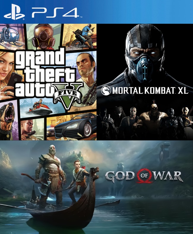 3 JUEGOS EN 1 GRAND THEFT AUTO V MAS GOD OF WAR MAS MORTAL KOMBAT XL PS4